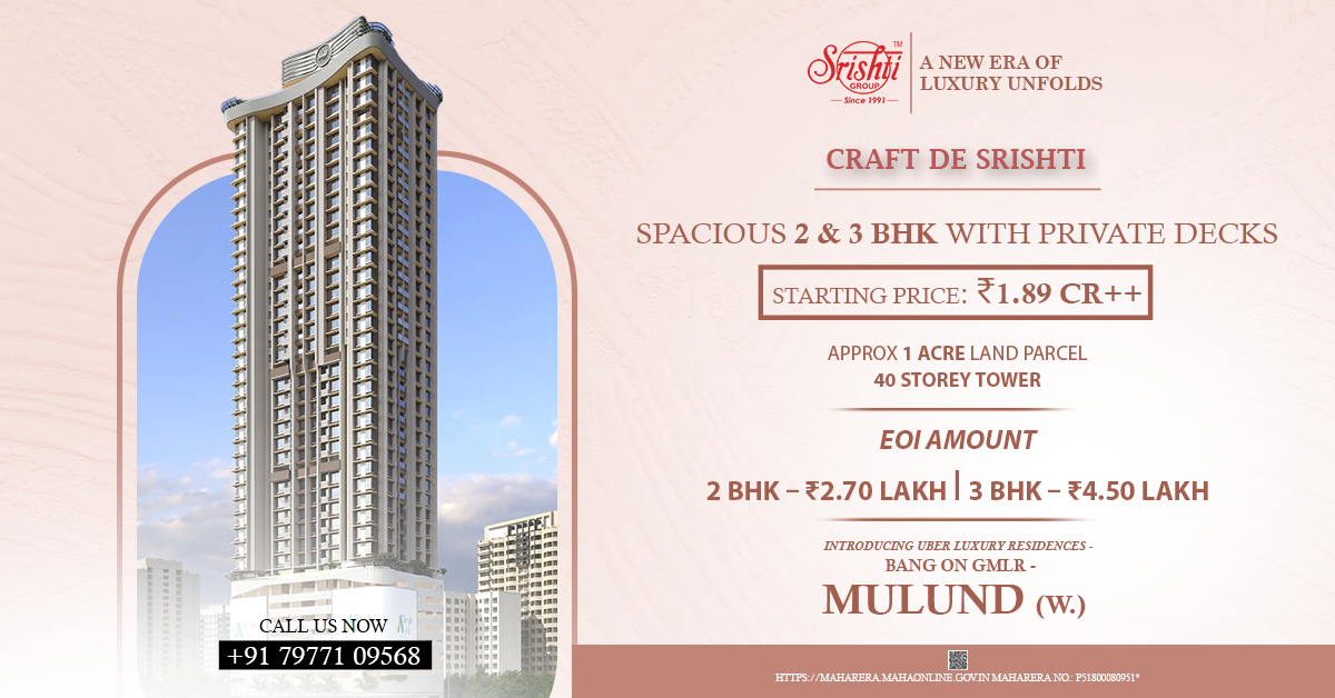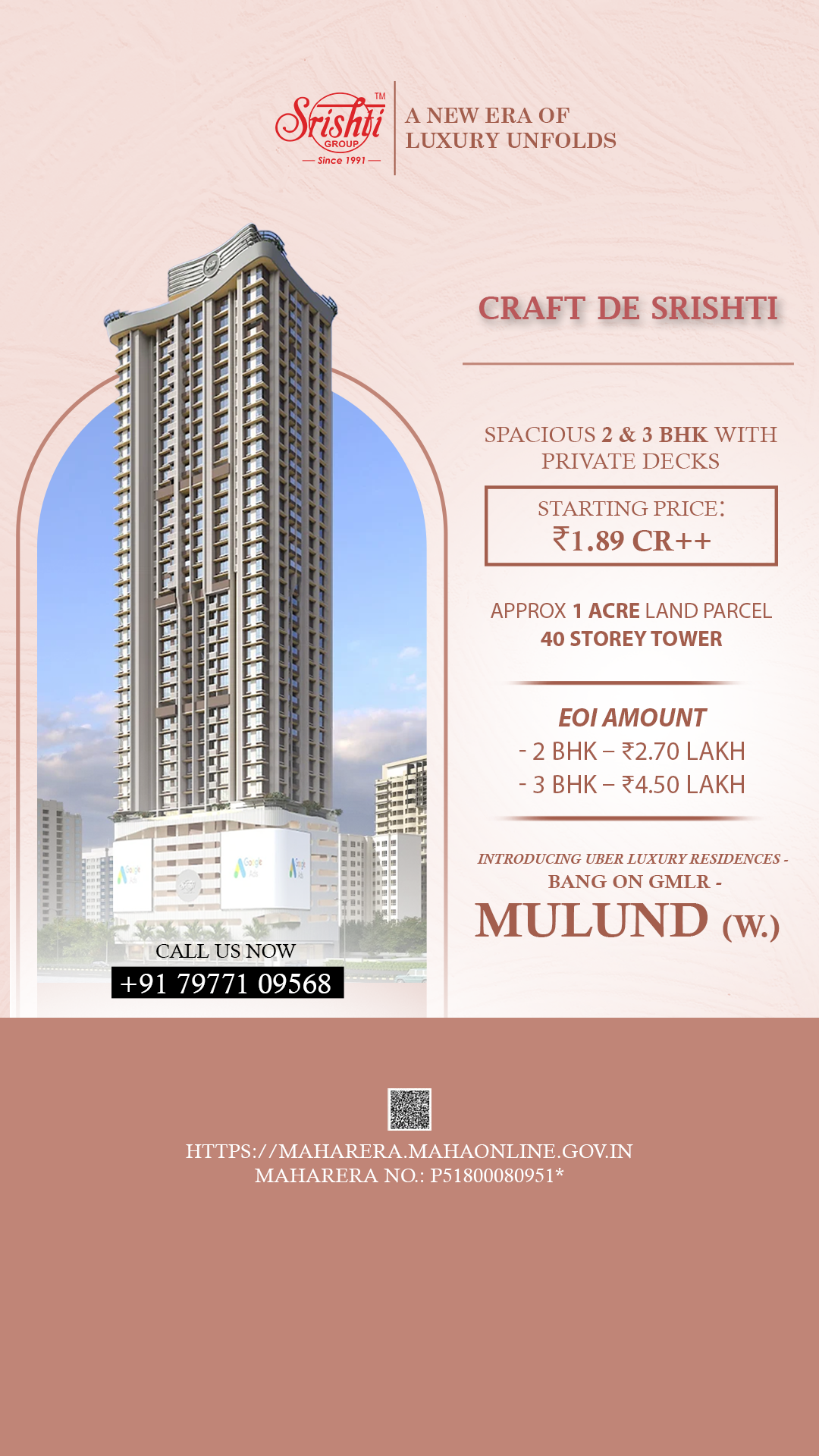 Craft De Srishti at Mulund West is an upcoming luxury residential development offering spacious 2, 3 and 4 BHK apartments with modern layouts, premium finishes, and lifestyle amenities. Positioned on the rapidly developing Goregaon–Mulund Link Road (GMLR), the project enjoys excellent connectivity to both the Eastern and Western suburbs of Mumbai. Show More